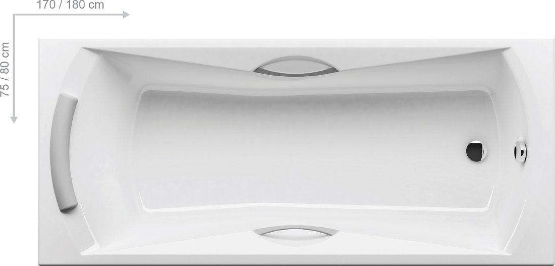 акриловая прямоугольная ванна в размерах 180 x 80, 170 x 75 со встроенными ручками; можно дополнить подголовником и шторой для ванны; также в исполнении PU Plus; подходит для установки гидромассажной системы.